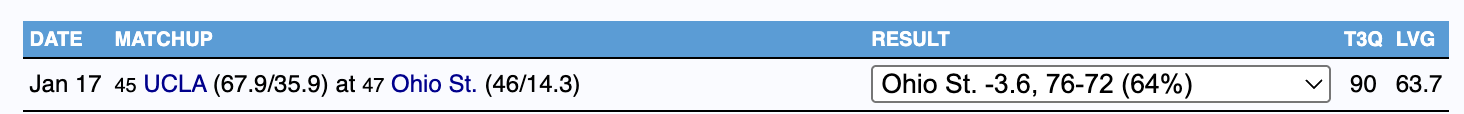 Fine, then. I actually think this is an incredible Vibes Test for two teams with fanbases that are very frustrated with their coaches, both of whom may have legitimate reasons for why their rosters aren't working (injuries, NIL, various spiritual gremlins). If UCLA wins, they'll have gone 2-0 on their latest Midwest road trip, and while neither Ohio State nor Penn State will be that likely to make the future NCAA Tournament, it is meaningful for the West Coast teams to go undefeated any time they have to trek east.