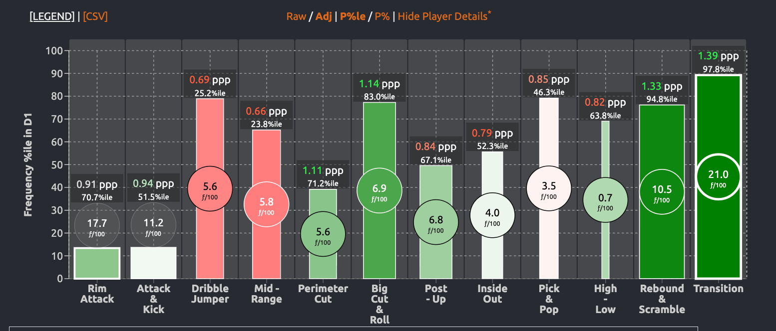 The Tommies meanwhile roll mostly vacated lane, which creates an 89th percentile catch and shoot rate (where the Tommies haven't missed all season) and allows Nolan Minessale to find isolation matchups he can pick on and attack with a free path to the rim, where he's an elite finisher and contact sponge.
