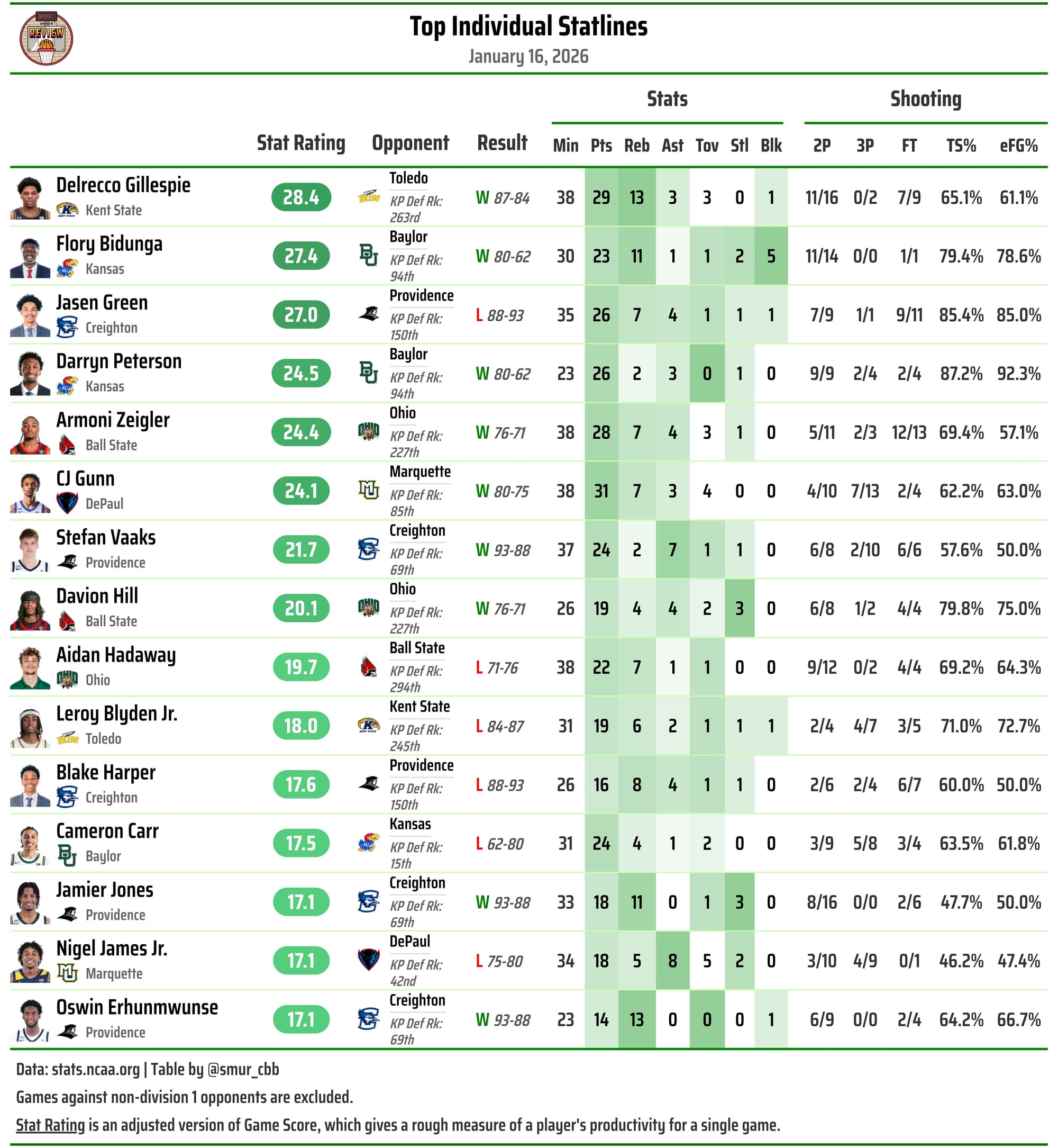 Okorie may have had a chance for ACC Freshman of the Year if Cameron Boozer didn't exist, but he most certainly does. I could do queries galore to demonstrate how much of a statistical anomaly Boozer is. He dropped a cool and casual 21 points, 13 rebounds, and three assists as Duke took down Cal on Wednesday, and no one batted an eye. He's tied for first in the country in KenPom Game MVP awards with Houston's Kingston Flemings and... wait... does that say Ebuka Okorie?
