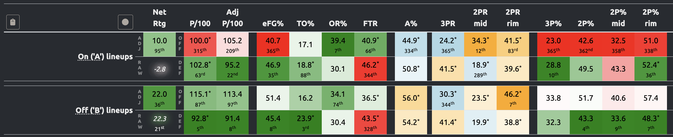 Minnesota, meanwhile, has been...less great away from home. They're 3-4 and play like the 26th-best team in America away from home, largely because they cannot get to the line at all thanks to a super-high midrange attempt rate. Drop coverages have been a problem, which makes a game against an Oregon team that prefers to hard-hedge really interesting. Can Minnesota hit the short roll and create 4-on-3 situations with frequency? If so, it could outweigh any amount of shooting advantages Oregon has at their home confines.