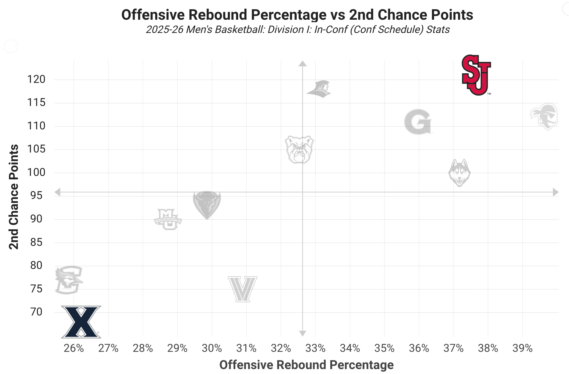 St. John’s ranks second in offensive rebounding rate and first in 2nd chance points per game, while Xavier is ranked last in those two categories. How long sophomore center Jovan Milicevic stays on the floor against potential conference player of the year Zuby Ejiofor could tell the story for this game. Ejiofor is averaging 18.1 points and 7.4 rebounds per game in conference action, with 5.9 of those points coming in second-chance opportunities and 4.1 of those rebounds being offensive rebounds.