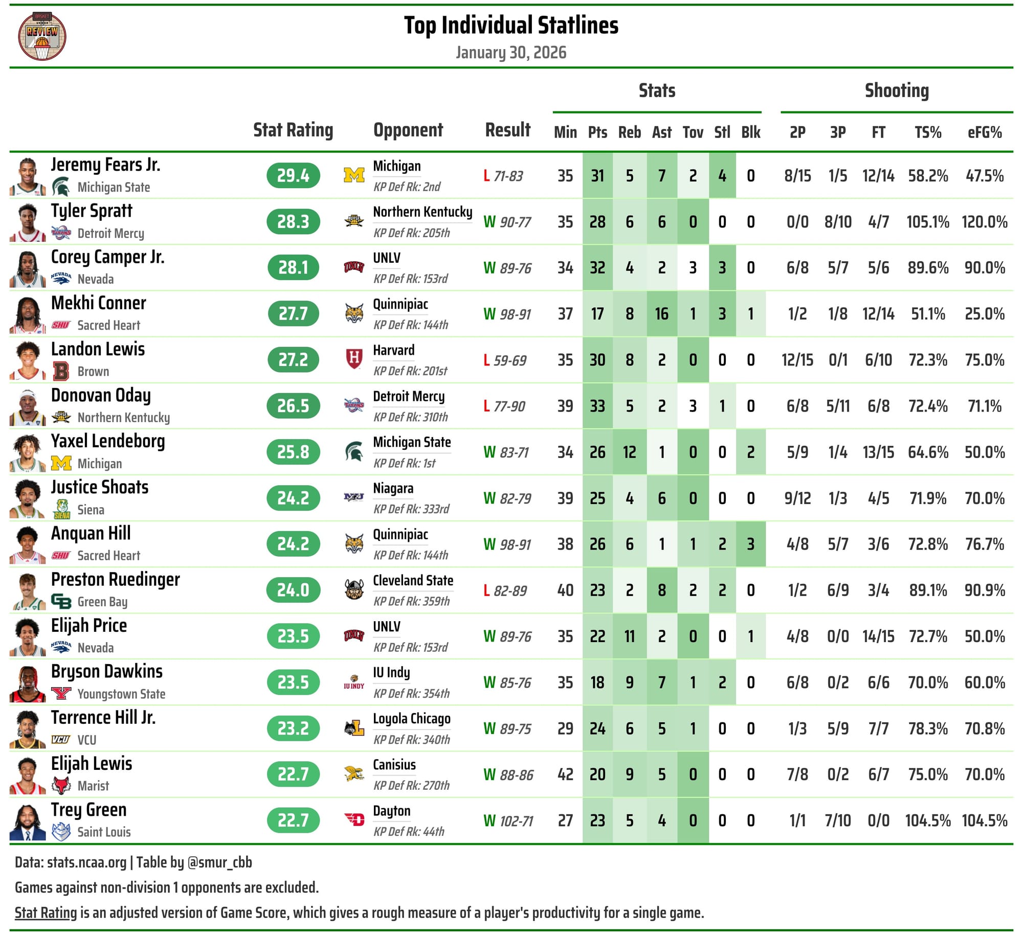 I felt higher than the national consensus on both two weeks back but I'd caution against a full buy-in beyond either's KenPom ranking. This is still an Auburn team that's very bad defensively (the Tigers have held two of their last 15 opponents below 1 PPP, and those were Queens and South Carolina), and it's still a Tennessee team with a pretty serious turnover problem. Still...you tell me Tennessee ends up a 4 or 5 seed and Auburn a 7, I'd believe that. Both are perfectly capable of a second weekend run.