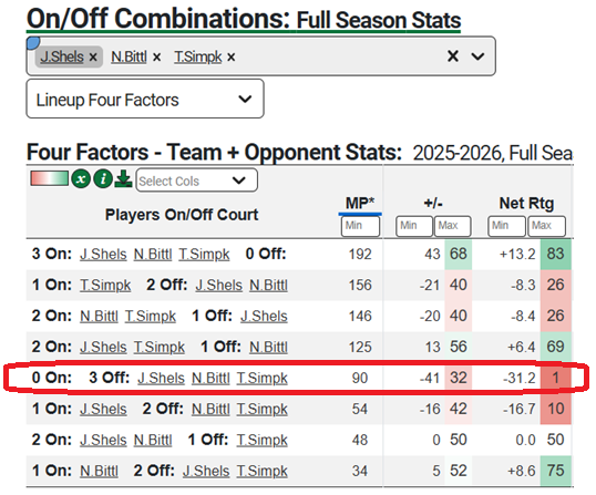 Without both star bookends on the court, Oregon has a -16.2 Net Rating per 100 possessions, per CBB Analytics – good for the 11th percentile nationally. To make matters worse, TK Simpkins missed last game as well. In 90 minutes this season with all three on the bench, Oregon is a pathetic -31.2 per 100 possessions: