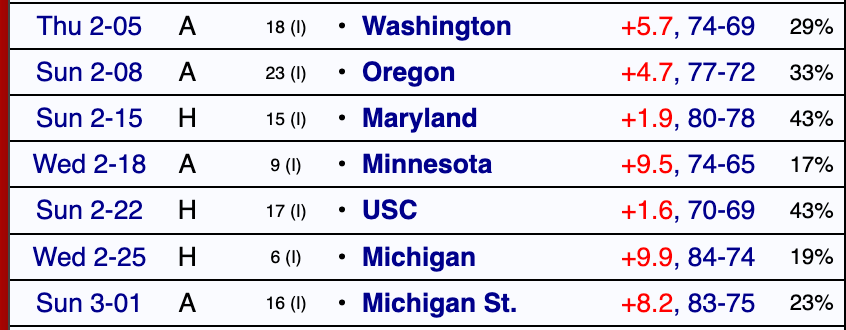 #10 UConn (-1) at #21 St. John's, 8 PM ET, FOX. This, as of now, is the ultimate UConn Test. The only other game in which UConn's favored by fewer than 8 points the rest of the way is road Villanova on the 21st. They're up to an 11% chance to go undefeated in the Big East, becoming THE FIRST TEAM TO EVER DO THAT IN LEAGUE HISTORY...and their own fans are kinda annoyed by the level of play they've seen since, no joke, a game on my birthday.