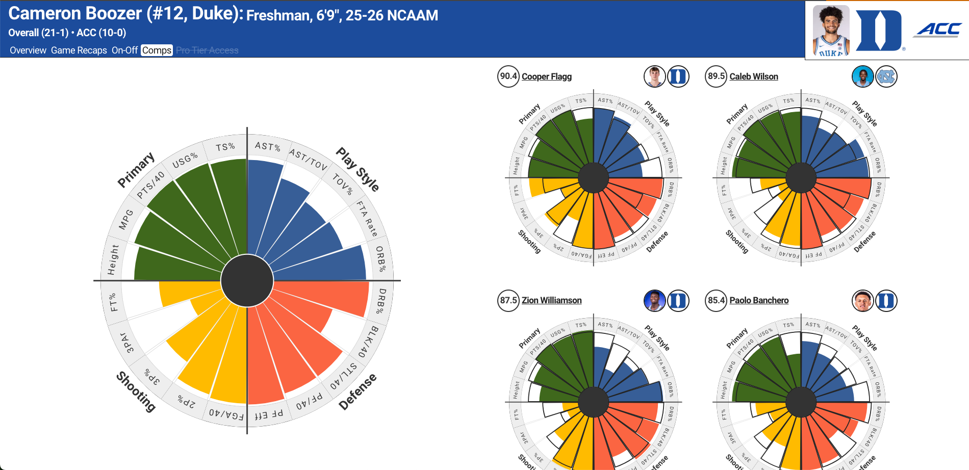 The biggest storyline here, obviously besides the fact that it's Duke/North Carolina, is the battle between surefire lottery picks at the 4-spot, Caleb Wilson and Cameron Boozer. Perhaps my favorite stat with this matchup is that according to CBB Analytics, Cameron Boozer's closest ACC analytical comps over the last seven years: Cooper Flagg and Caleb Wilson, followed by Zion Williamson and Paolo Banchero. Stop hogging all the good players, blue bloods!