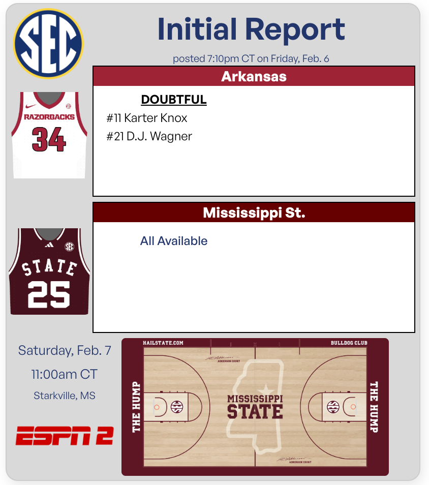 This would typically have all the hallmarks of a get-right game for Arkansas. They've had a full week to stew on their upsetting home loss to Kentucky, this is their worst (by KenPom) opponent left on the schedule, and they still have the best-shooting offense of any SEC team in conference play. Now, to take a big sip of my 5:59 AM coffee and check the injury report.