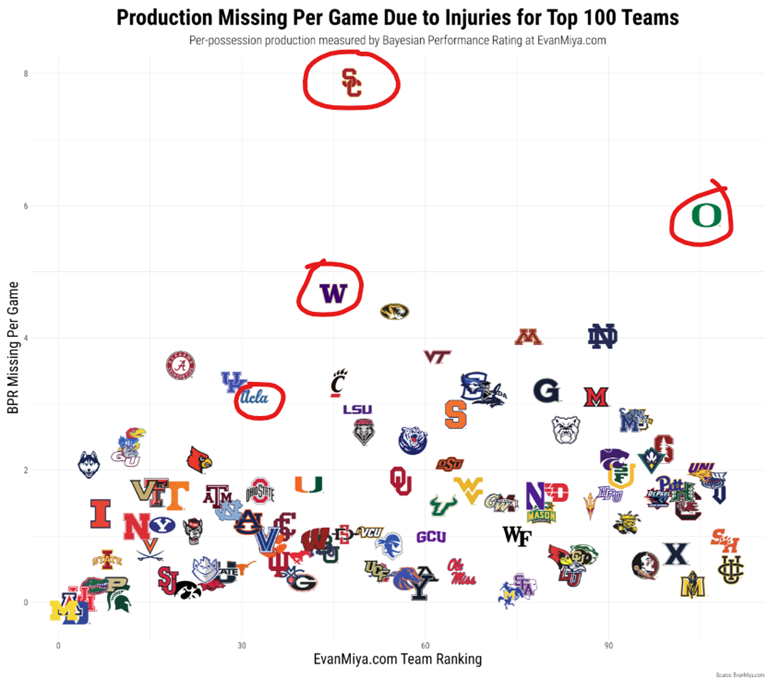 What did these poor west coast Big Ten schools do to the basketball gods? This chart via EvanMiya shows just how decimated by injury all four teams have been, making it all the more impressive that both Washington and UCLA remain in the NCAA Tournament at-large picture (ok, that’s being charitable for 12-11 Washington):