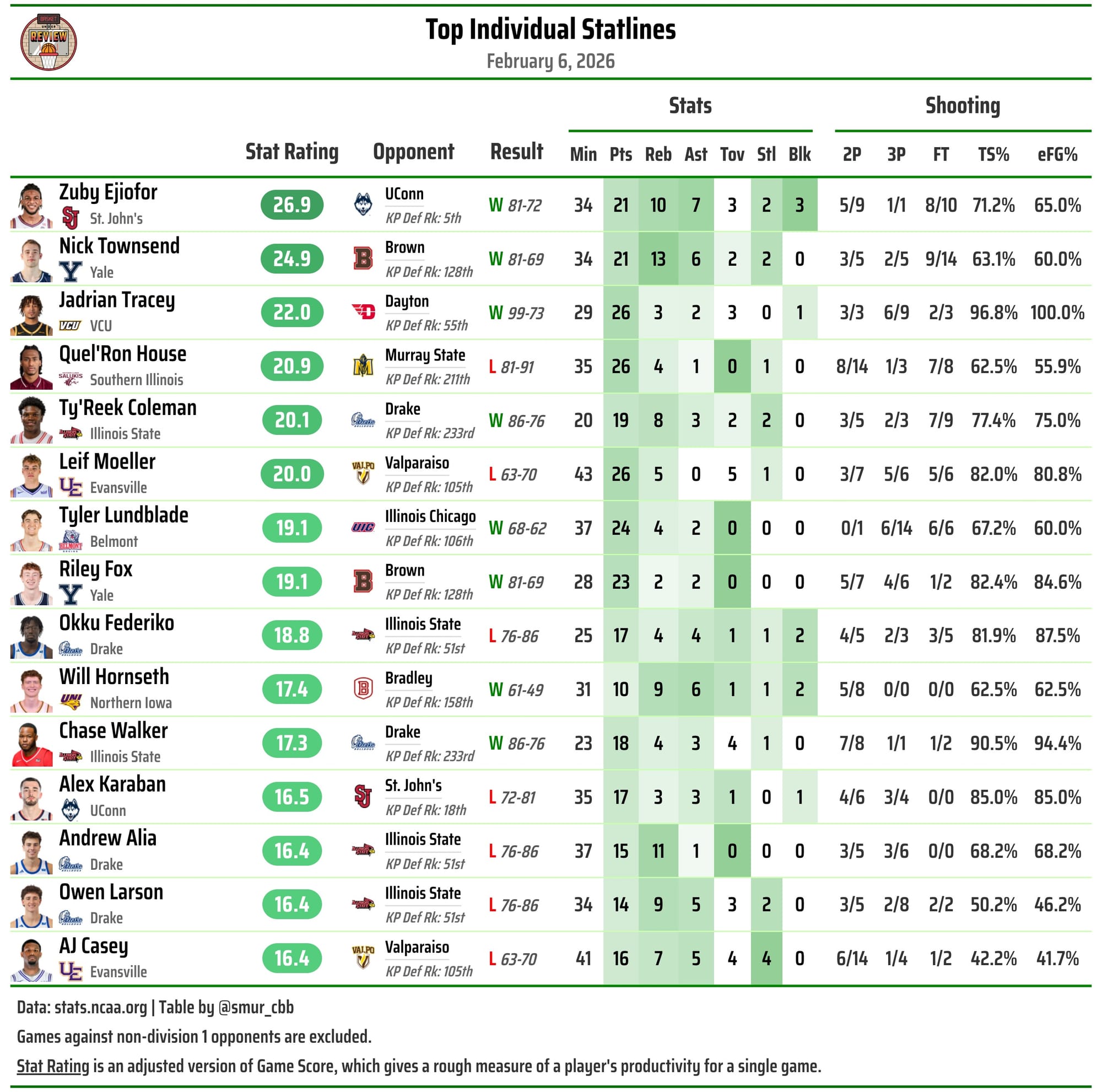 Akron is coming off their two least efficient offensive outings of the season, but still beat their rival Kent State by double digits (KSU was an appalling 1-23 from 3 in that game) and followed that up with another win at Eastern Michigan despite their worst offensive output of the year by a wide margin. Obviously heading to Troy in the heart of the conference season isn’t the most ideal way to course correct your offense if you’re John Groce, but in theory the Zips’ ball movement and spacing should enjoy Troy’s zone pressure, much like they did against Tulane’s similarish defensive scheme (1.24 PPP in a romp). Akron has made the 3 ball at a 5% lower clip on the road than at the JAR, but their road defense is actually the 12th best in the country per Torvik filtering, mostly thanks to opponents shooting 29% from 3 on high volume in their own gyms (worth noting Troy has shot just 33% from 3 on high volume at home). Troy is once again one of the more prolific “rim and 3” schemes in midmajordom, and run heavily through PNR (92nd percentile overall rate, per Synergy data). Akron plays a small but versatile lineup which features a lot of switching in their PNR coverage, but that could be problematic with the way Troy creates mismatches with point-wing Victor Valdes in ball screens. Schematically I’m partial to Akron, situationally I would think a noncon wrench thrown in the middle of heated conference play generally favors the home team. - Jordan Majewski