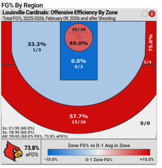 The Cardinals' shot breakdown would make an analytics nerd proud. Louisville took 59 of their 65 shots from deep or right under the hoop in the contest. Funny enough, they went 1-for-6 in the "inefficient" looks.