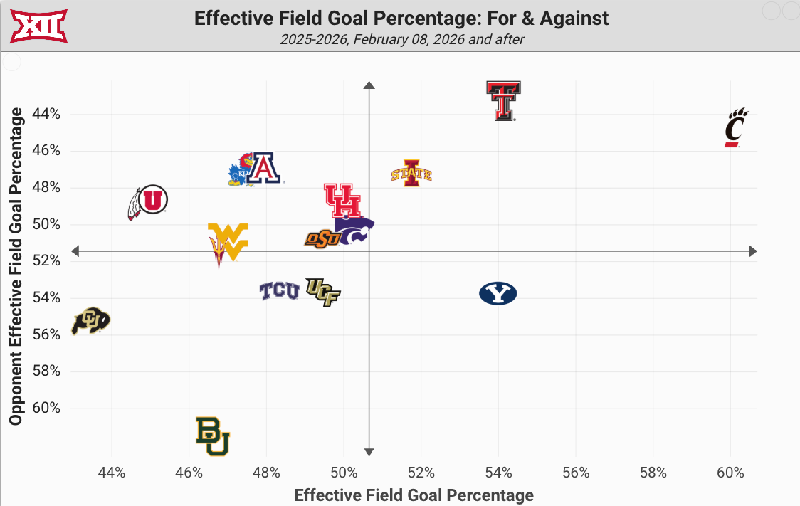 During this stretch, Wes Miller’s team has posted the best effective field goal percentage in the conference while allowing the second-lowest opponent effective field goal percentage. We’ll see if that offensive efficiency travels to Phog Allen, where opponents are shooting 37.3% from the field, the fifth-lowest average amongst high major teams.