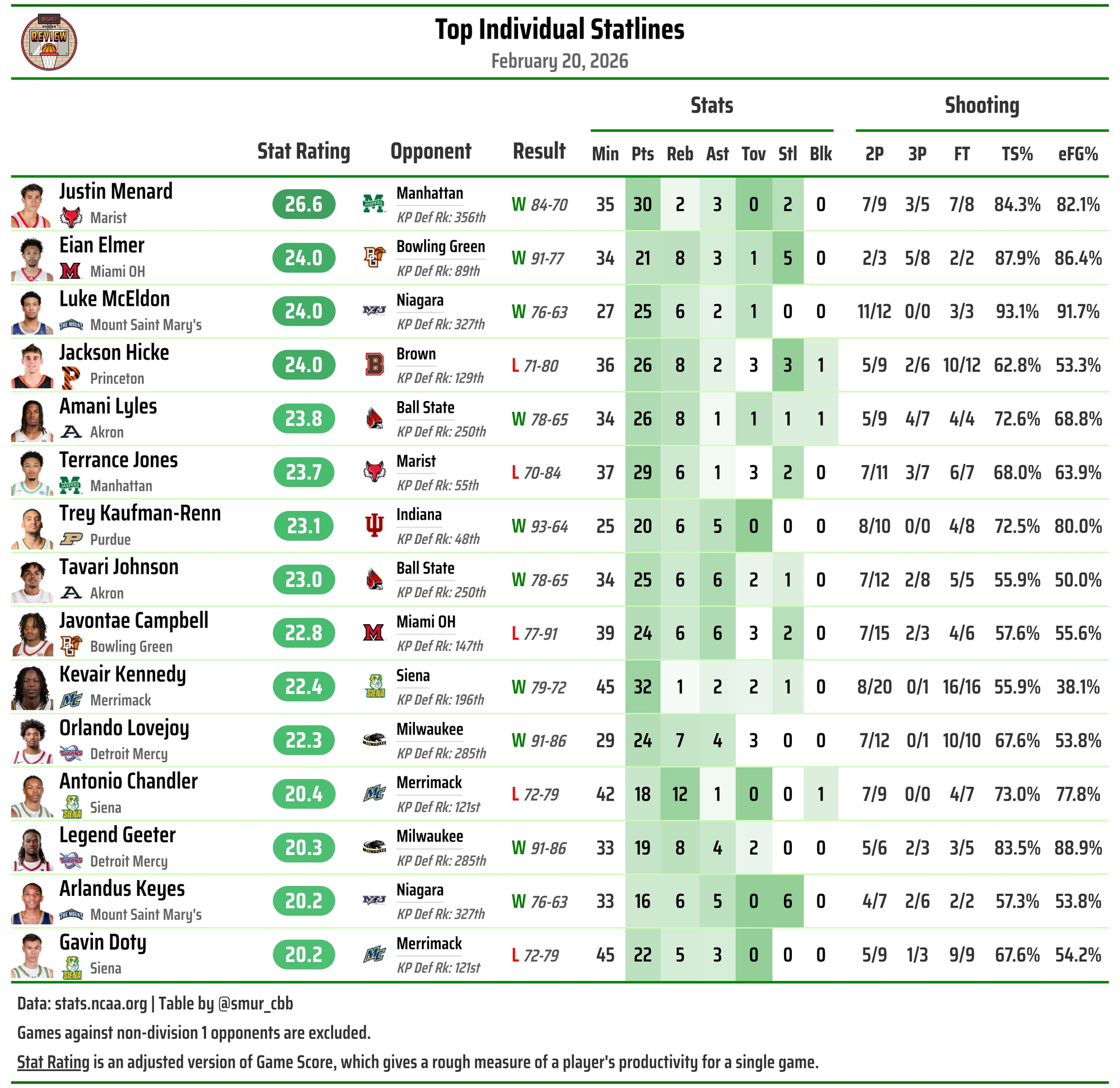 With Walker on the block however, ISUred scored 40 points in the paint, their second highest total of the MVC season, while Bradley scored just 24- but the Braves' inability to score at the rim (least efficient rim offense in the Valley) probably continues with or without Walker in the lineup. The real issue for Bradley that game was Jaquan Johnson's inefficiency as a ball screen scorer against ISU's drop coverage. Bradley has lost every Valley game Johnson has scored 14 or fewer points, as they simply don't have a lot of scoring options. The Braves are also running a wild +18% 3PT% delta in the month of February (SIU contributed heavily with a nice 0-15 in there). - Jordan Majewski
