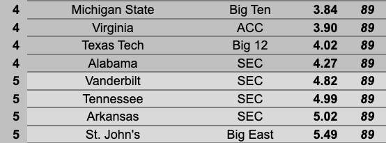 Compare the win rates over the last 25 years for 4s versus 5s - 79% in the R64 versus 61%, 63% in the R32 versus 57% - and while it is literally one integer it does seem meaningful. As always in the Oats/Barnes ‘rivalry’ it’s my duty to note Tennessee has won five straight in this series and Alabama’s last win was 1) a home win in 2021 2) that came with Tennessee missing two starters due to illness. I must also note that the first game this year came with Alabama down a pair of starters, but that win seemed to kickstart Tennessee’s ‘new season’ of sorts, having gone 8-2 since.