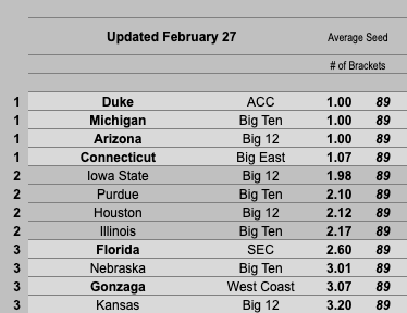 I think that, barring some sort of shocking outcome, the top 12 teams here are all locked into 1-4 seeds.
