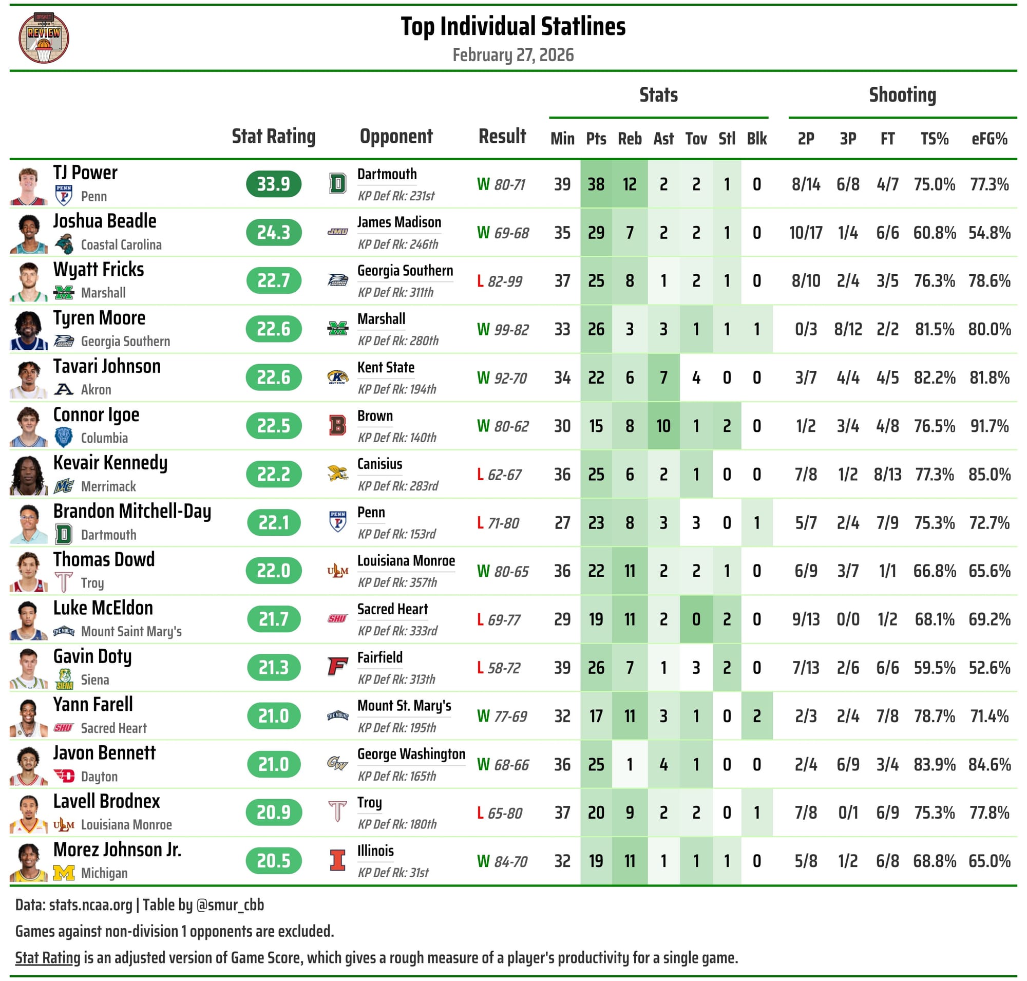 Defensively Ross Hodge is an excellent schemer, and they’ve posted strong defensive metrics despite being unlucky in catch and shoot defense (where they’re 99th percentile in c&s graded guarded by Synegy). Brennen Lorient is also an outstanding individual defender with size and mobility to at least throw at AJ Dybantsa, but BYU has only lost once (to Arizona) when Dybantsa has 5+ assists. He scored efficiently against UCF, but tallied 0 assists for just the second time all season. West Virginia’s defensive scheme necessitates ball movement (highest assist rate allowed in the league), but again, without Richie Saunders, options to score outside of Dybantsa isos and Rob Wright ball screens are few and far between. That should theoretically be enough to outscore this WV offense, but BYU’s 3 road wins aren’t exactly mouth waterers. They underwhelmed at a brutal Kansas State team, barely got by Utah in the Holy War, and let a 6 man Baylor team go for 1.3 PPP. - Jordan Majewski