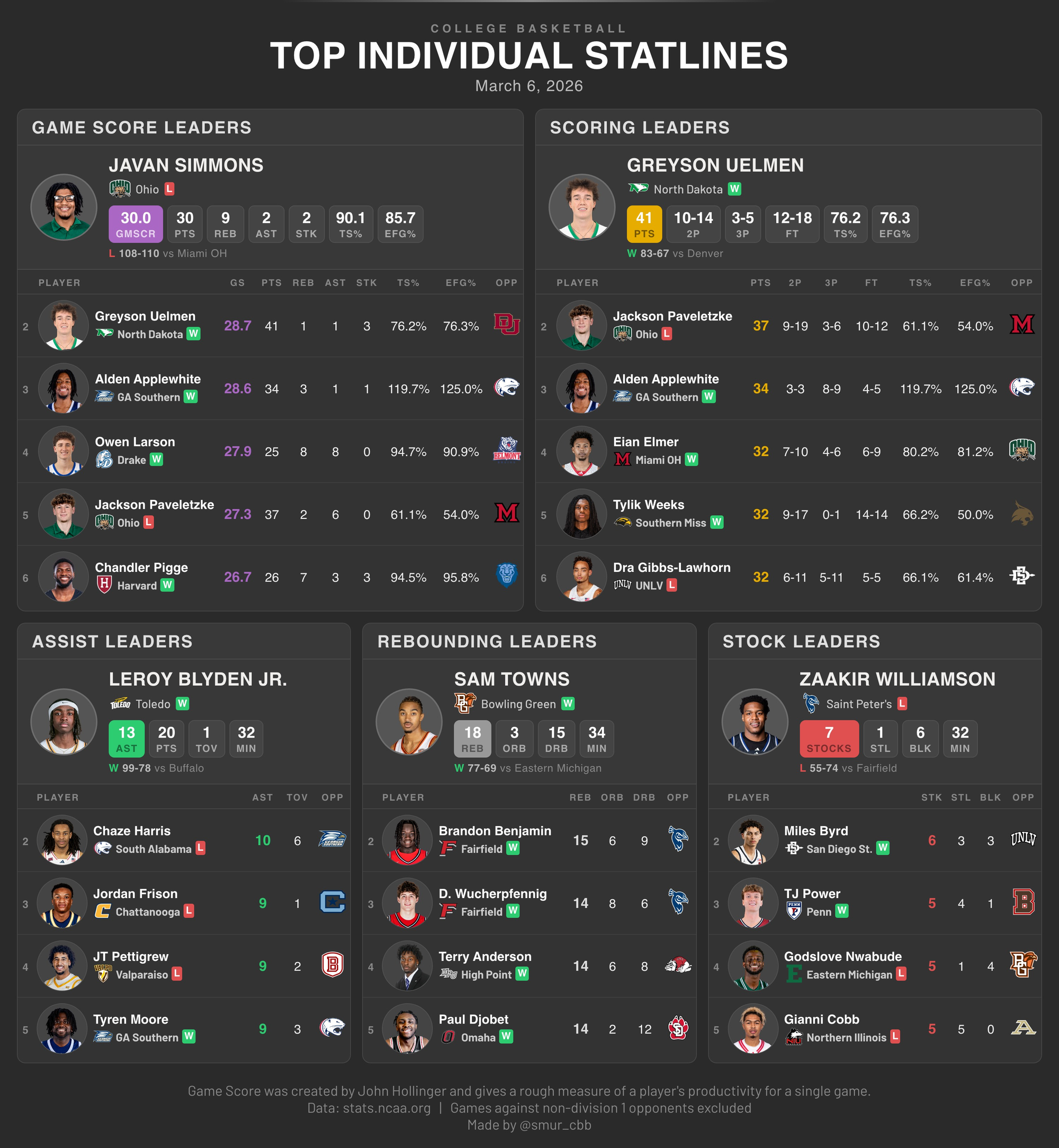 Djobet scored 60 points in the regular season series, but it was actually Ja’Sean Glover who carried the Mavs to the semis, similarly dominating in ball screens and isolation against South Dakota. Omaha rallied late in Fargo thanks to 15-31 3PT shooting, by far their best shooting performance of the season, but that same 5 out mismatch hunting offense they deploy was shredded at the rim by NDSU’s array of post threats and aggressive cutters. The Mavs’ 5th percentile rim defense efficiency rating and league worst 2PT% defense are the glaring issues in this semifinal matchup. - Jordan Majewski