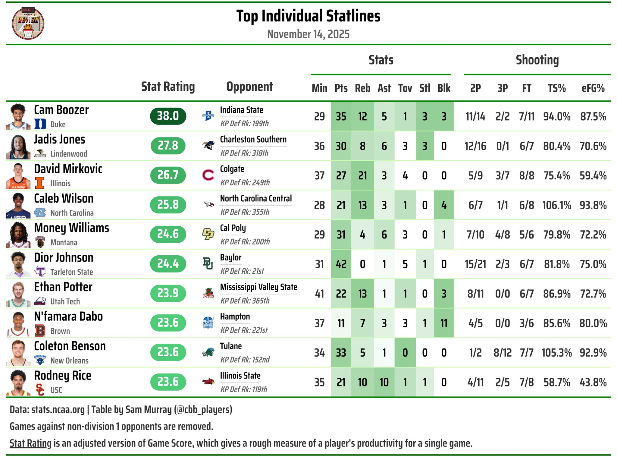 Indiana is scorching-hot to begin the Darian DeVries era, notching 98+ points in each of their three victories on .663 eFG% (fifth-best in the country). The Hoosiers are creating for each other well – 70.9% of FGM are assisted — and letting it fly from deep at a level not seen under the previous two head coaches. IU made more than 12 3s in a game only twice over the eight combined seasons under Archie Miller and Mike Woodson; it is averaging 12.7 made 3s per game so far this season under DeVries, thanks to Lamar Wilkerson and Tucker DeVries combining to start 27-for-48 (56.3%) from beyond the arc.