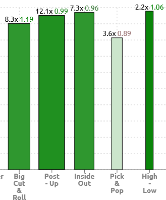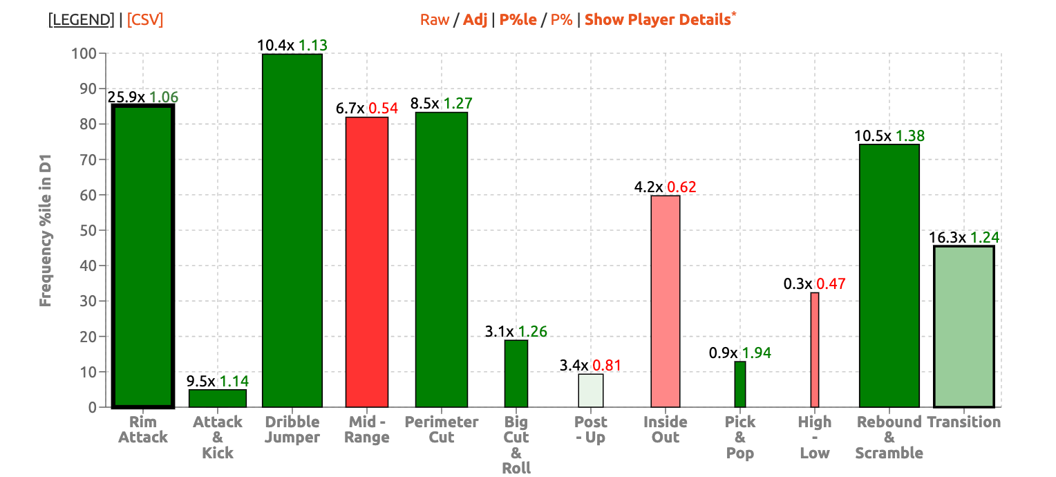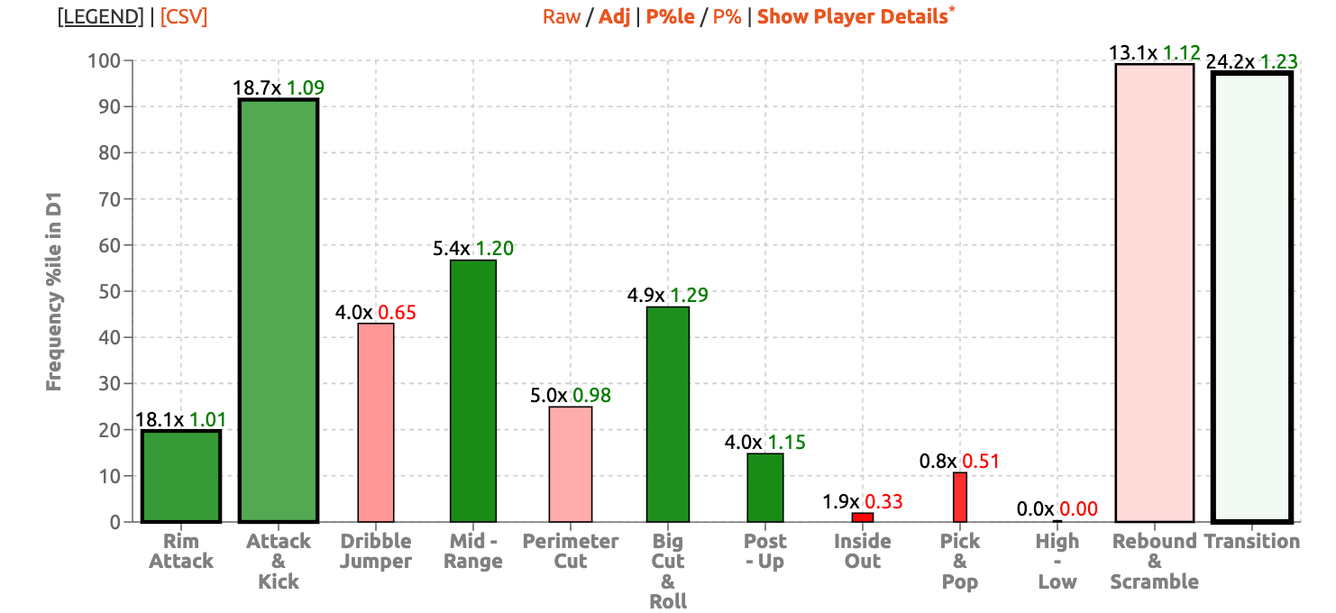 Because of the extreme spacing provided by CSU's setup, Hoop-Explorer has the Rams fourth nationally in usage of cuts to the basket from the perimeter, which is very intriguing when Utah State's in the 84th-percentile of allowing those actions.