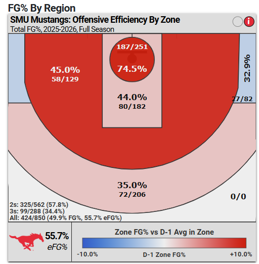 The Mustangs rank in the 84th percentile in midrange frequency and the 90th percentile in efficiency, per CBB Analytics. Both Miller and Pierre shoot over 46% from that range.