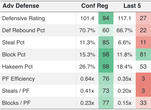 San Diego State’s interior has been downright brutal during this closing tailspin, culminating in the Aztecs recording just 15 rebounds against Boise State, their lowest total in the season and the lowest total in at least the last 15 seasons. In keeping with the numerology bit here, the Aztecs are also giving up 15 2nd-chance points per game in their last 5 games, which equates to 19% of their opponents’ points. That per-game average puts them in the bottom 5 percentile of the country for 2nd chance point defense.
