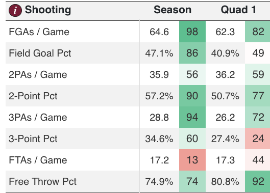 The Aggies needed to dominate league play to secure an ideal seed line, given their limited Quad 1 opportunities and signature wins. Their best wins on the season are all bubble teams (VCU, San Diego State, New Mexico). If they don’t win emphatically to close out their final run of MWC games, they may find themselves in Dayton playing in the First Four.