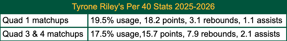 To add further confusion, Riley had his best games going up against better competition. He averaged 17 points on efficient shooting in games against Quad 1 teams, considerably higher than his season average of 11.7 points. He’s proving Gerlufsen’s projection of perimeter scoring correct, shooting 46.5% on 43 attempts so far this season. However, a bigger step and greater output will be required for the Dons to become the team they set out to be.