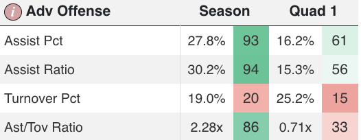 But this year, ball security and defense haven’t been up to the high expectations that previous Gaels clubs have set. Their 11.2 turnovers per game is the highest since the 2021-2022 season. This is also the first season since 2021-2022 that they aren’t leading the conference in opponent effective field goal percentage. But perhaps most surprising is that, after leading the conference in offensive and defensive rebounding rates for three seasons straight, the Gaels lead the WCC in neither category.