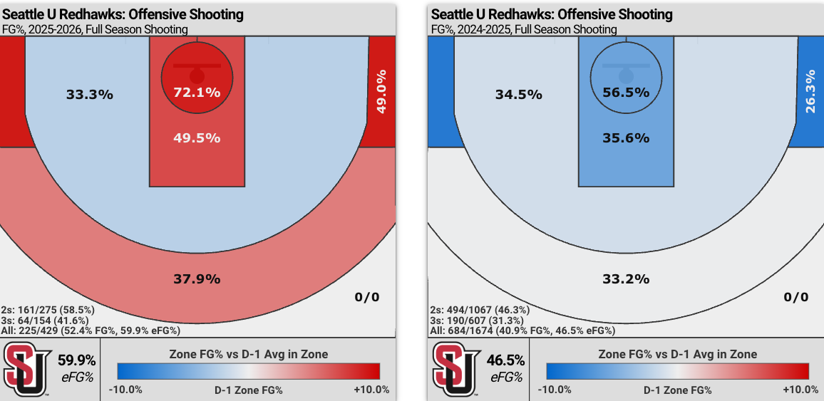 Their success has come from the development of their interior scoring. The Redhawks have gone from 35.6% in the paint and 56.5% at the rim to 49.5% and 72.1%, with sophomore Will Heimbrodt leading the charge, scoring 10.3 of his 16.4 points per game in the paint. He’s shooting 80.6% at the rim and has demonstrated the ability to playmake, averaging 2.6 assists per contest.