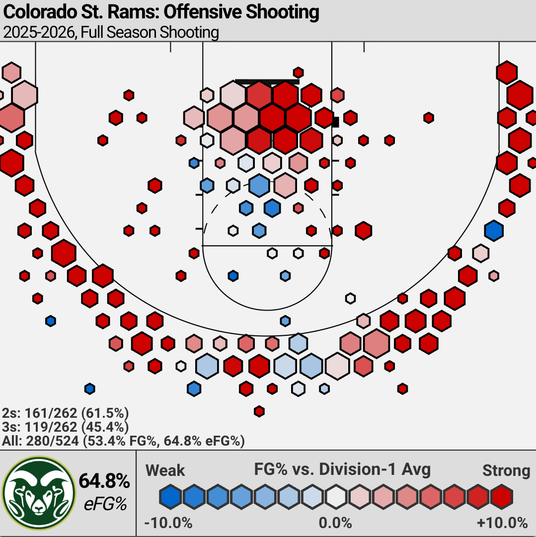 Farkhmanesh’s staff has tilted the game to maximize Colorado State’s shooting while minimizing their defensive shortcomings (233rd in the country in opponent effective field goal percentage). The Rams pair their highly efficient three-point shooting with the 361st pace of play in the country and limit opponents to the 58th lowest offensive rebounding rate in the country. That combination leads to Colorado State’s opponents having the fewest total rebounds in college basketball.