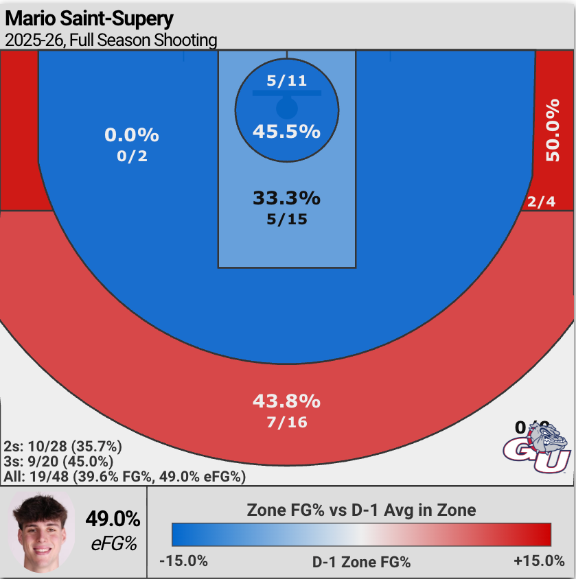 For Gonzaga to break past their high floor expectations as an elite defense that will punish decent to good teams over 40 minutes and truly become a Final Four caliber squad, they need Saint-Supéry to take a leap by March and become a real scoring piece to match his more than capable ability to facilitate the offense.