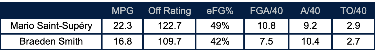 What is concerning for the Bulldogs is that the minutes pecking order still seems to be in flux after their trip to Vegas. Against high-caliber teams, Saint-Supéry has claimed 70% of the backcourt minutes with Smith taking roughly 30%. But throughout the season so far, that split is closer to 55% to 45%, suggesting a committee approach that the numbers don't seem to warrant.